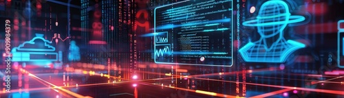 Futuristic digital landscape showcasing holographic interfaces, data patterns, and virtual tech elements representing cyber innovation.