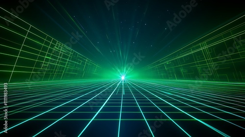 Futuristic Digital Landscape with Neon Lines and Grid Creating an Abstract Sci-Fi Background