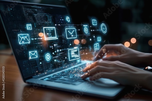 Futuristic Digital Learning with Laptop and Holographic Icons in Soft Blue Light