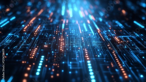 Futuristic digital lines and glowing nodes form an intricate pattern on a dark background, symbolizing technology and connectivity in a modern landscape.