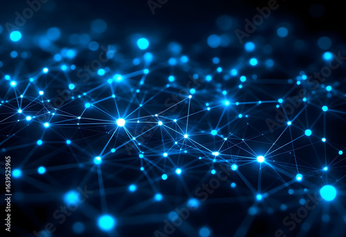 Futuristic Digital Network Background – Glowing Blue Nodes and Polygon Mesh Connections for AI, Blockchain, and Technology Designs