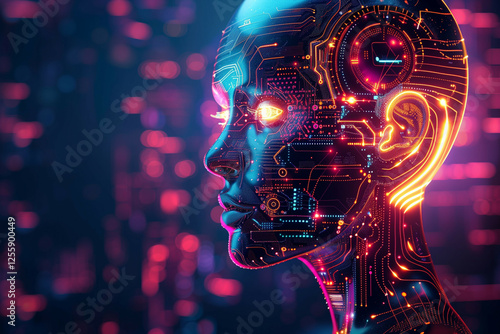 Futuristic digital rendering of a humanoid head profile with intricate circuit designs and glowing elements, set against a vibrant neon backdrop
