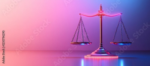 Futuristic digital scales of justice illuminated in vibrant neon colors against a gradient backdrop
