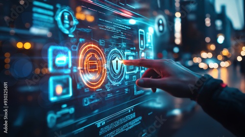 Futuristic digital security interface, touching a glowing shield icon. The advanced holographic display is set against a blurred cityscape, symbolizing cyber security and technology.