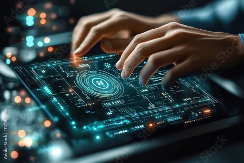 Futuristic Digital Workspace with Holographic VPN Interface, Cyberpunk Style, Secure Connection, Technology and Privacy Theme
