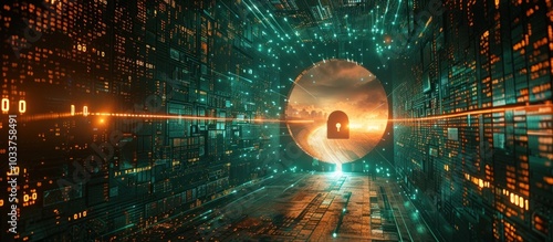 Futuristic digital world of interconnected cyber technology data network and information security Depicts a complex digital landscape with binary code server infrastructure