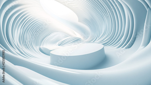 Futuristic display podium in white and blue in an abstract architectural space with curved modern structures and minimalist lighting effects