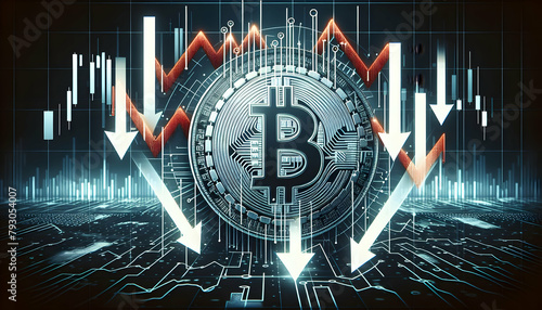 Futuristic Downtrend Dynamics: Dynamic arrows pointing downwards overlaid on a Bitcoin symbol to depict market downtrends in Bitcoin with abstract chart