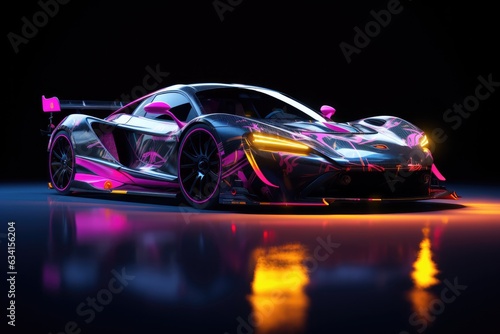 Futuristic drift car in motion with neon fast lines and abstract smoke. High speed concept in technological blue purple colors
