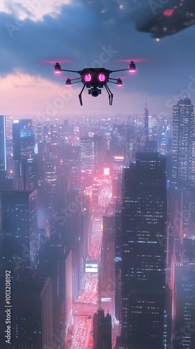 Futuristic drone capturing daily life in a vibrant, serene cityscape, blending technology with simplicity