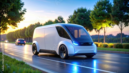 Futuristic electric delivery van driving on a clean road at sunset symbolizing sustainable urban transportation and innovation