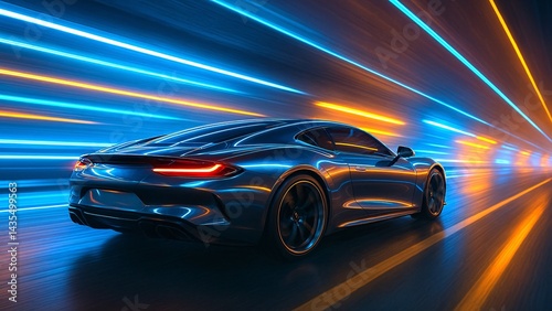 Futuristic electric vehicle speeding on a highway illuminated by vibrant neon lights, creating motion blur and a sense of high velocity in a dynamic and colorful scene