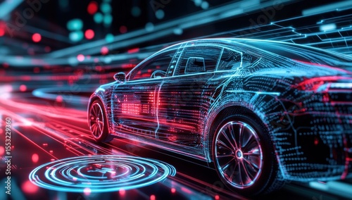 Futuristic electric vehicle with digital data overlay.