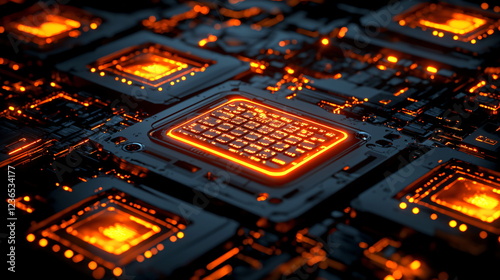 Futuristic electronic circuit board with glowing orange components and intricate patterns, showcasing advanced technology and intricate designs in a high-tech environment.