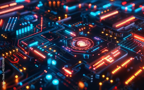 Futuristic electronic motherboard with colorful neon lights, representing modern technology and advanced circuitry in a digital landscape.