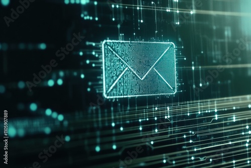 Futuristic email icon surrounded glowing circuits, symbolizing communication technology.