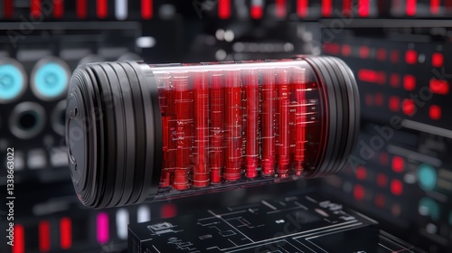 Futuristic Energy Storage Device with Red LED Displays and Digital Circuitry Background in High-Tech Setting