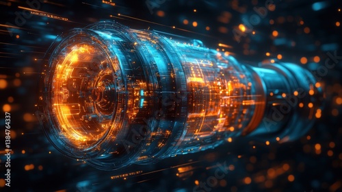Futuristic engine in motion, glowing with vibrant energy, digital particles, in space