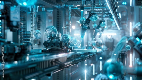Futuristic Factory Assembly Line with Robotic Arms and Crystal Spheres