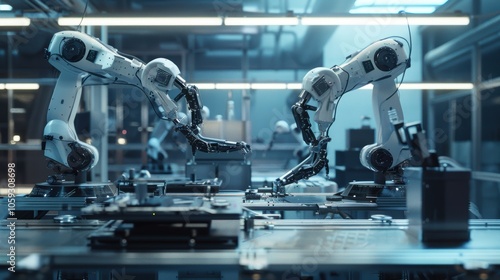 Futuristic Factory with Robotic Arms Assembling Exoskeleton Suits for Industrial Innovation