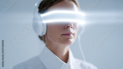 Futuristic female call center agent wearing glowing headset smart glasses. Woman uses virtual reality technology to work with data and customer service. AI tech support.