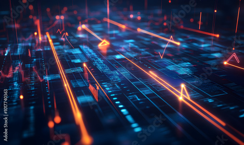 Futuristic financial dashboards and luxury business charts with glowing neon lines, gold accents, and connected nodes for corporate branding.
