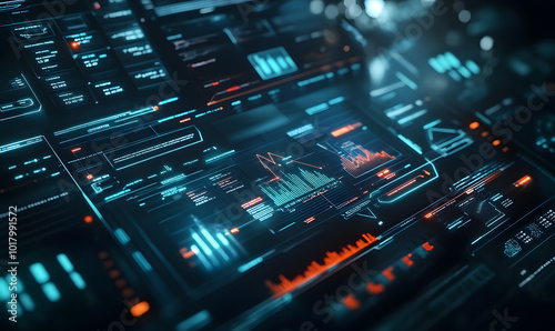 Futuristic financial dashboards and luxury business charts with glowing neon lines, gold accents, and connected nodes for corporate branding.