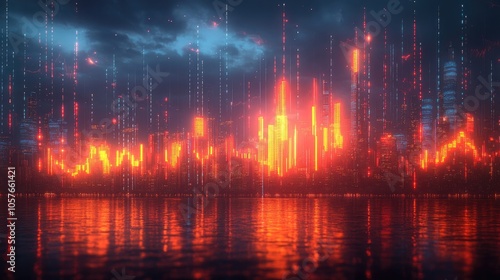 Futuristic financial market data visualization displaying dynamic candlestick charts and fluctuating graphs against a night skyline. Ideal for finance presentations, trading analytics