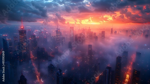 Futuristic Floating Cityscape with Dramatic Neon Lights and Vivid Clouds in Sci-Fi Atmosphere