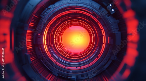 Futuristic geometric design with glowing orange and red circular elements.