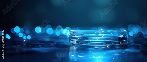 Futuristic Glass Disc with Blue Bokeh Lights on Reflective Surface - High-Tech Concept