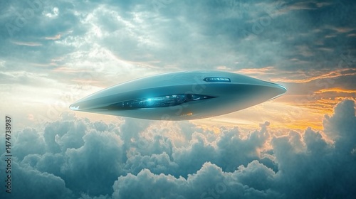 Futuristic, glossy spacecraft hovering among fluffy clouds at sunset