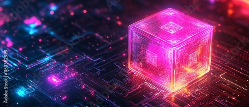 Futuristic glowing cube on a digital circuit board, representing AI, technology, and data processing, with neon light effects and hightech digital patterns