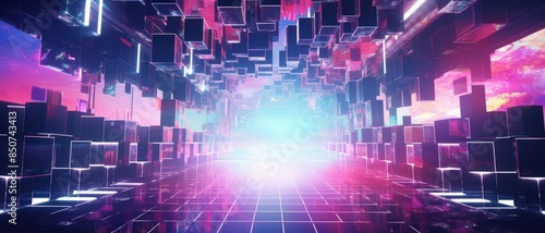 Futuristic glowing digital cityscape composed of vibrant neon lights, geometric shapes, and a perspective leading to a bright horizon.