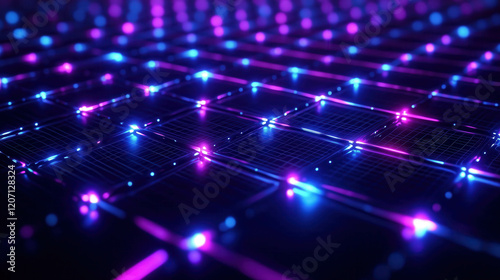 Futuristic glowing grid pattern expanding into infinity with neon lights