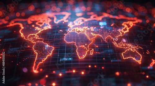 Futuristic glowing map of the world with a digital grid overlay depicting global connectivity and technology abstract concept.