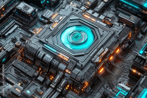 Futuristic glowing microchip in a digital circuit, technology and data concept