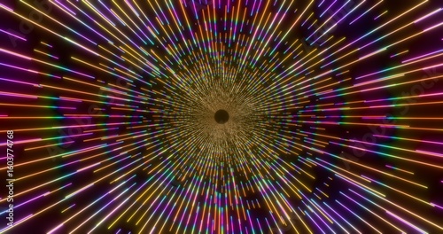 Futuristic glowing neon waving rays background. Shining geometric rainbow lines inside tube in perspective. Bright retro digital cyberspace. 3D rendering.