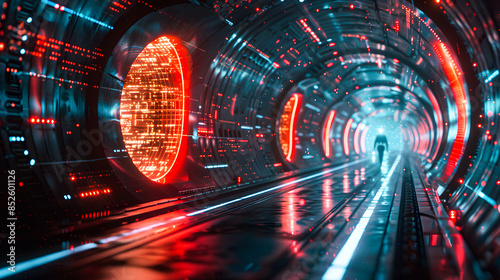 Futuristic glowing tunnel with vibrant neon lights and intricate technological design, offering a high-tech sci-fi atmosphere.