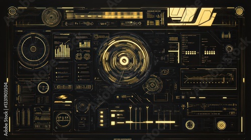 Futuristic gold and black digital interface with various data displays, graphs, and controls.