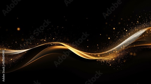 Futuristic golden particles shimmering on a black background with a wave-like abstract pattern,