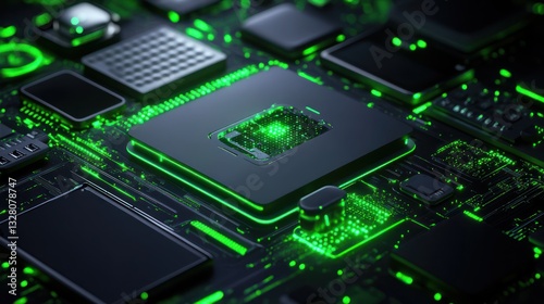 Futuristic Green Circuit Board: A High-Tech Microchip Close-Up
