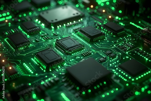 Futuristic Green Circuit Board with Integrated Microchips and Glowing Lights