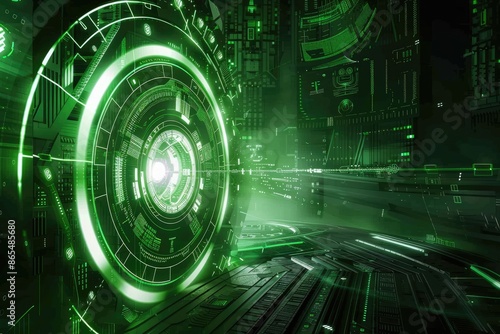 Futuristic green cyber portal in a digital world. High-tech concept with glowing lights, circuits, and advanced technology.