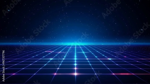 Futuristic grid landscape with glowing neon lights and starry background, perfect for technology or sci-fi themes.