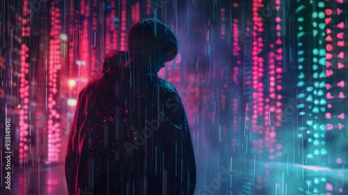 Futuristic hacker with neon code projections from natural gas cascading down like digital rain
