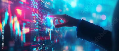 Futuristic Hand Interacting with Digital Stock Market Data Visualization, Analyzing Graphs and Trends in Vibrant Neon Colors for Financial Innovation