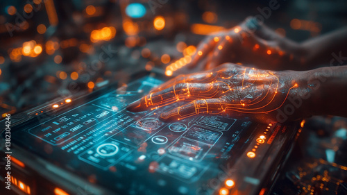 Futuristic hands manipulate a glowing holographic interface, showcasing advanced technology and digital interaction.