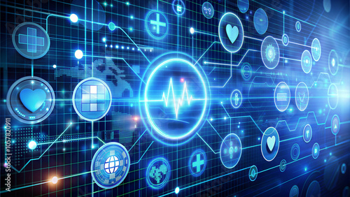 Futuristic healthcare technology concept with heart rate monitor and medical icons on a digital background