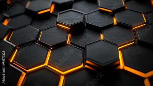 Futuristic hexagon grid, metallic texture, reflective surfaces with glowing edges, set against a sleek black background, high-tech aesthetic, Steampunk, Crisp Details